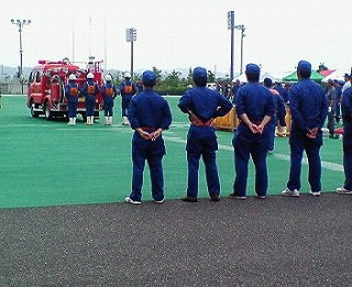 その後、9時半ごろになってしまいましたが北播消防操法大会を見学させてもらいました。上記写真のとおり選手は汗だくになりながら頑張っていましたが、隊員も競技中は整列をして選手の活躍を応援されていました。又、分団からも多数の方が応援にこられており、同じく整列をし競技の選手を激励しておられました。