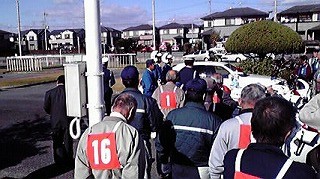 小野シルバー人材センターに所属されている方々の中から50名程度の方が参加されていました。自動車の運転技術の研修で、兵庫県警から白バイが2台・覆面パトロールカー1台の参加を得、県警の方より色々と説明を受け、その後白バイ2台での模範運転の披露がありました。そして、参加者全員による自分の自動車での運転の実施研修が行われました。自動車教習所の教習コースを利用しながら班別での運転実施。中々皆さん技術は結構なものでした。中には50歳で運転免許を取得された女性が居られ、切り替えし等の非常に難しい所謂通称「たこつぼ」状況の運転にトライされ見事に脱出に成功されていました。