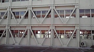 又、現在取組んでいます学校耐震工事の現況について、旭丘中学校・河合中学校・小野南中学校の3校のうち旭丘中・河合中の2校を視察しました。写真は河合中学校の耐震補強状況の写真です。外壁に四角い枠(?)を縫い付け・それぞれの区画ごとに斜交いを入れ補強が行われています。