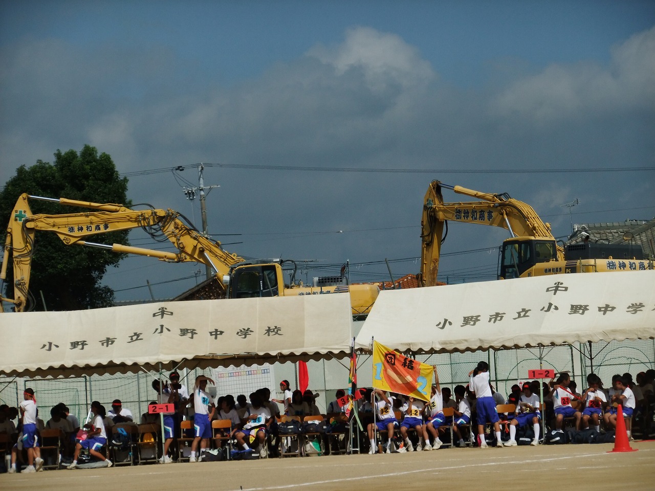 朝一番に、新築された小野中学校で最初の体育祭です。写真ではグランド北側に重機が6台。