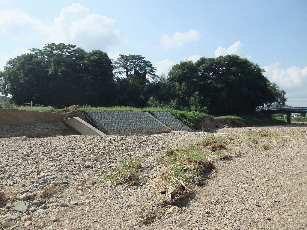 万勝寺川で、垂井町のグランドの下流部分の写真です。過去に被害があり補修された両サイドが、大きくえぐり取られています。